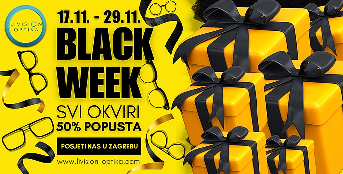 Od 17.11. do 29.11.2025. u svim Livision optikama traje BLACK WEEK – tjedan najboljih popusta u godini! Iskoristite priliku i obnovite svoj pogled na svijet uz super uštede na dioptrijske okvire, sunčane naočale, leće i još mnogo toga!