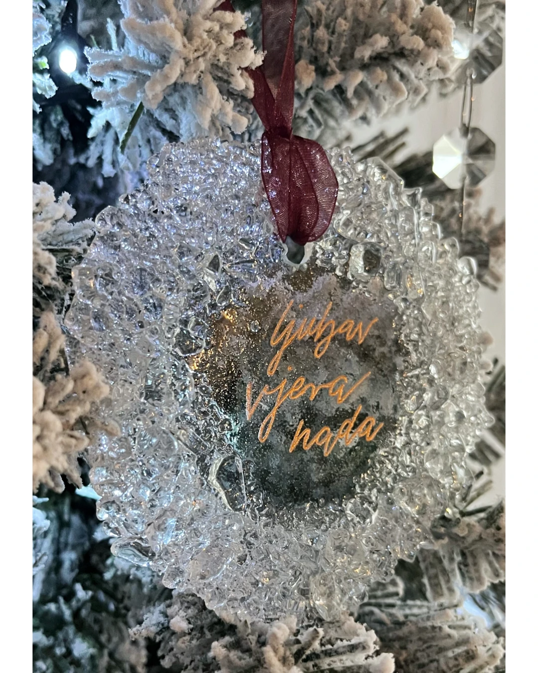 Središte prekrasne “zamrznute pahuljice”, u koje se smjestila personalizirana gravura s tekstom po želji svakog kupca, okruženo je tisućama malenih stakalaca koji prekrasno svjetlucaju kao kakvi kristalići.