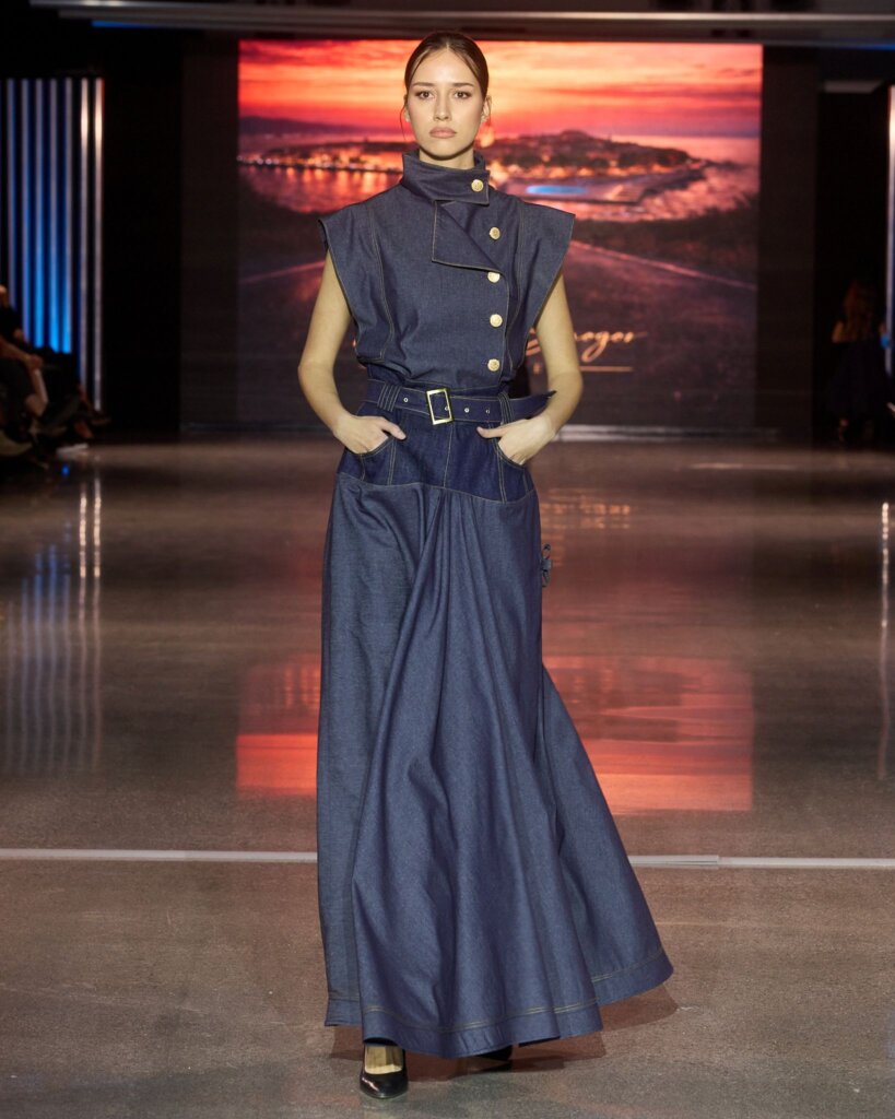 Natalija Smogor kroz kolekciju donosi suvremenu eleganciju kroz tamno plavu paletu i luksuzan traper, spajajući klasičan stil s modernim pristupom dizajnu. Fokus je na čistim linijama, izraženim krojevima i detaljima koji odišu profinjenošću od hlača širokih nogavica do haljina i košulja s voluminoznim rukavima stvarajući modernu siluetu koja odiše luksuzom i lakoćom pokreta.